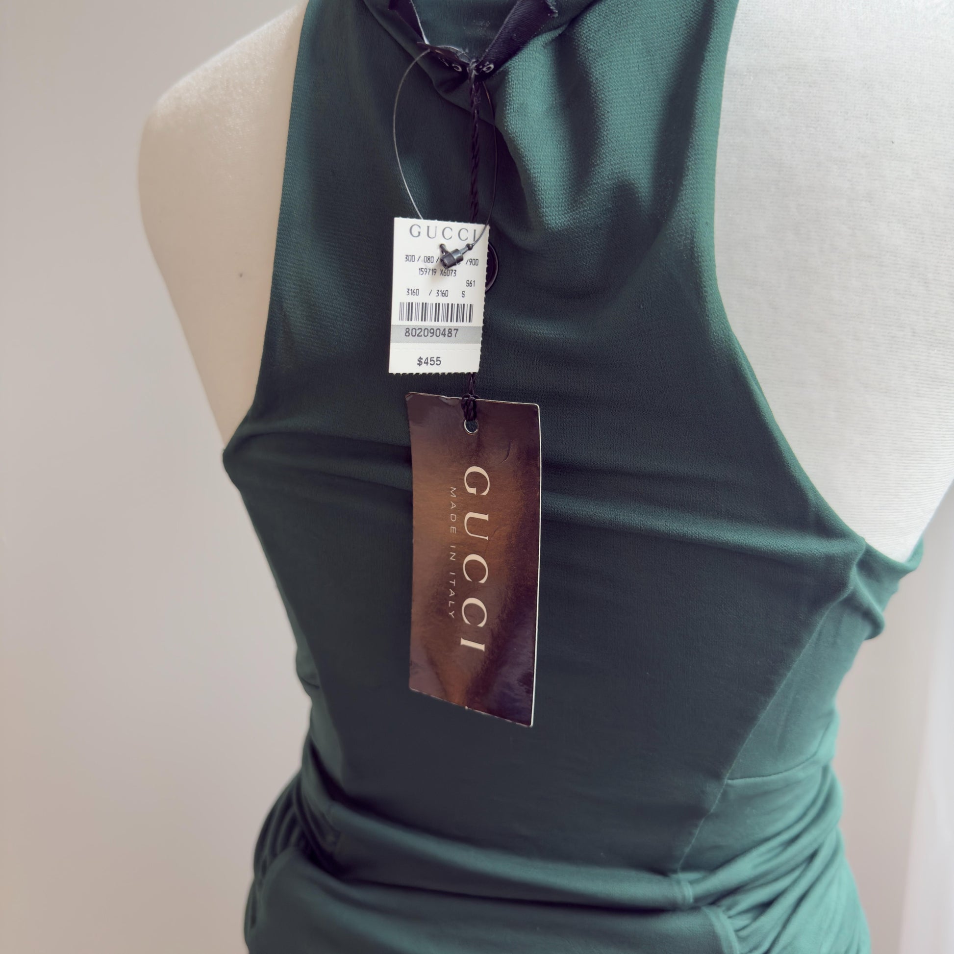 Vintage 2005 Gucci Green Top w/ original Tags. Minimal but sexy, this top features a plunging neckline and ruching details. Fabric is 100% rayon and is stretchy.
